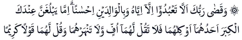 “Dan Tuhanmu telah memerintahkan agar kamu jangan menyembah selain Dia dan hendaklah berbuat baik kepada kedua orang tua. Janganlah engkau mengatakan kepada keduanya perkataan ‘ah’ dan janganlah engkau membentak mereka, dan ucapkanlah kepada mereka perkataan yang baik.”