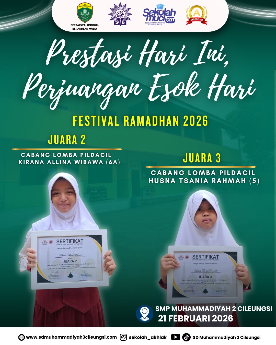 Assalamu’alaikum Sobat Mugaci. Alhamdulillah siswa SD Mugaci kembali menorehkan prestasi. Kali ini event di bulan Ramadan yang diselenggarakan oleh SMP Muhammadiyah 2 Cileungsi (Mudacils) pada Sabtu (21/2) kemarin.