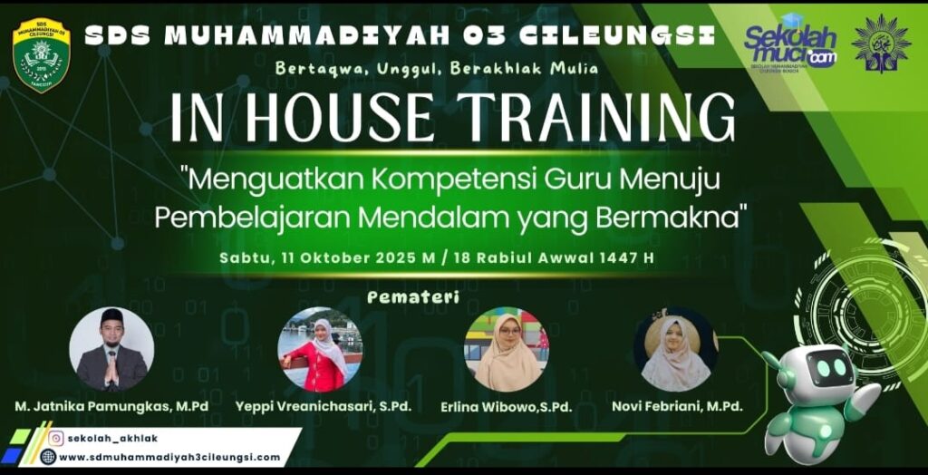 Cileungsi – Pada Sabtu (11/10) SD Muhammadiyah 03 Cileungsi untuk pertama kalinya mengadakan In House Training (IHT) pada tahun pelajaran 2025/2026. Bertempat di ruang kelas 1A, IHT 2025 mengangkat tema “Menguatkan Kompetensi Guru menuju Pembelajaran Mendalam yang Bermakna”, dihadiri oleh Ketua Majelis Dikdasmen dan PNF PCM Cileungsi, Bapak Namin Ibnu Solihin, M.Pd..