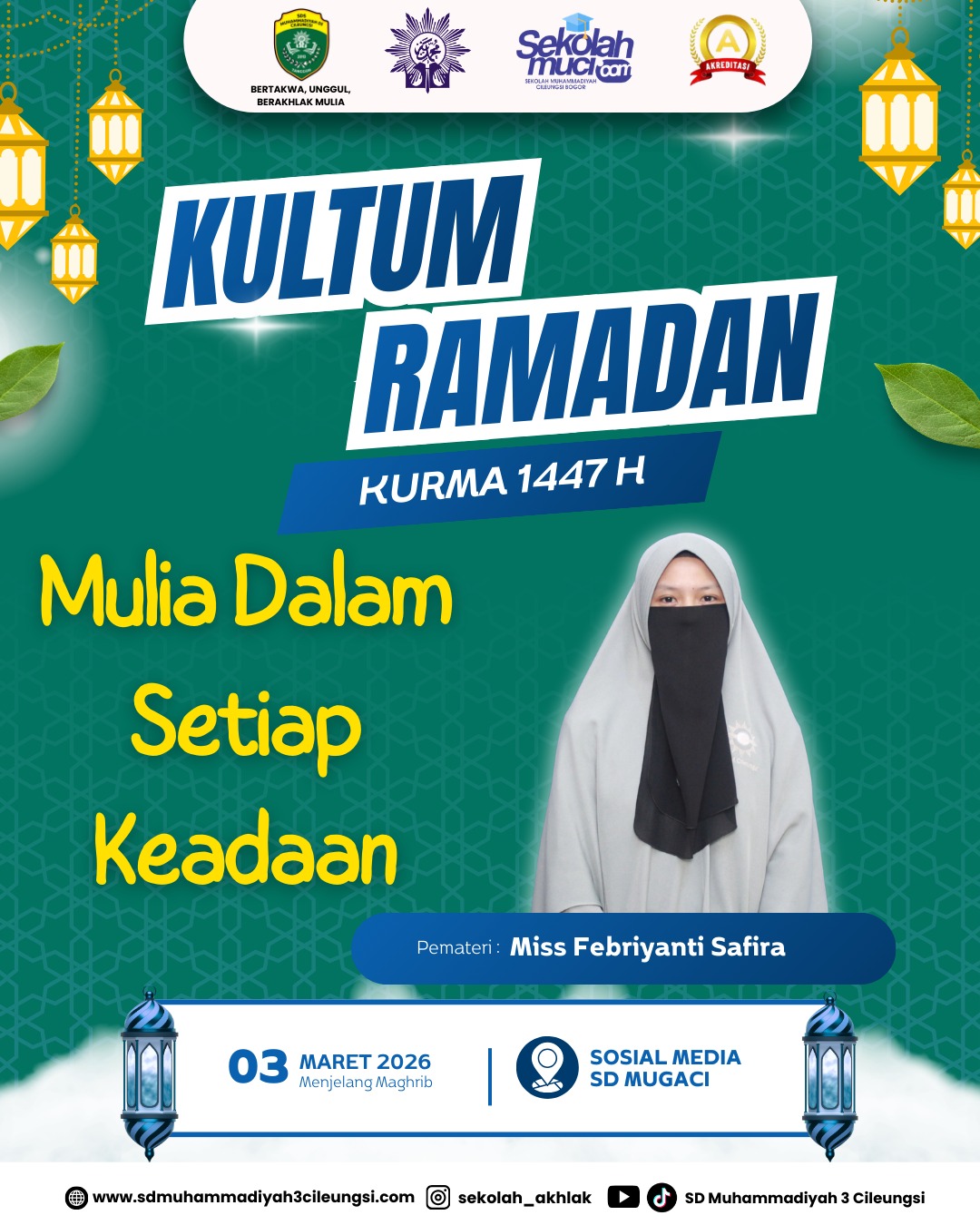 Kultum Ramadan (KURMA) 1447 H kembali hadir dengan tema “Mulia Dalam Setiap Keadaan”. Kultum ini disampaikan oleh Miss Febriyanti Safira, menjelang waktu Maghrib.