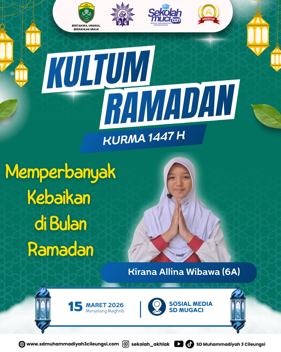 Kultum Ramadan (KURMA) 1447 H kembali hadir menjelang waktu berbuka puasa. Pada kesempatan kali ini, kultum disampaikan oleh Kirana Allina Wibawa, siswa kelas 6A SD Muhammadiyah 3 Cileungsi, dengan tema “Memperbanyak Kebaikan di Bulan Ramadan.”