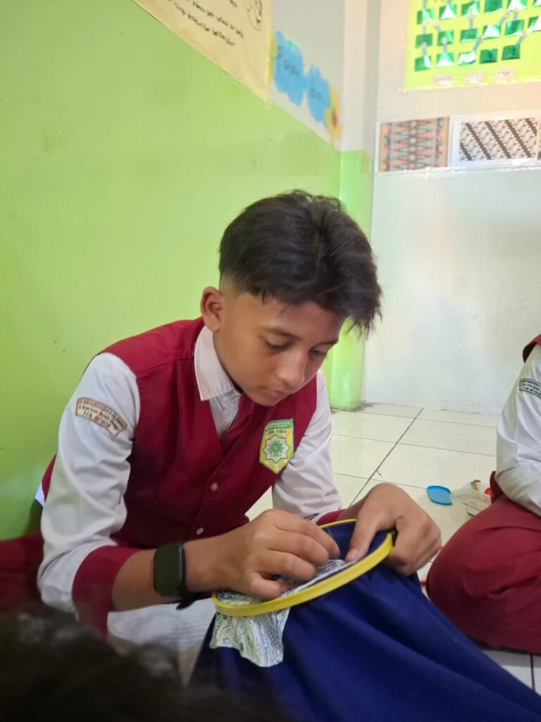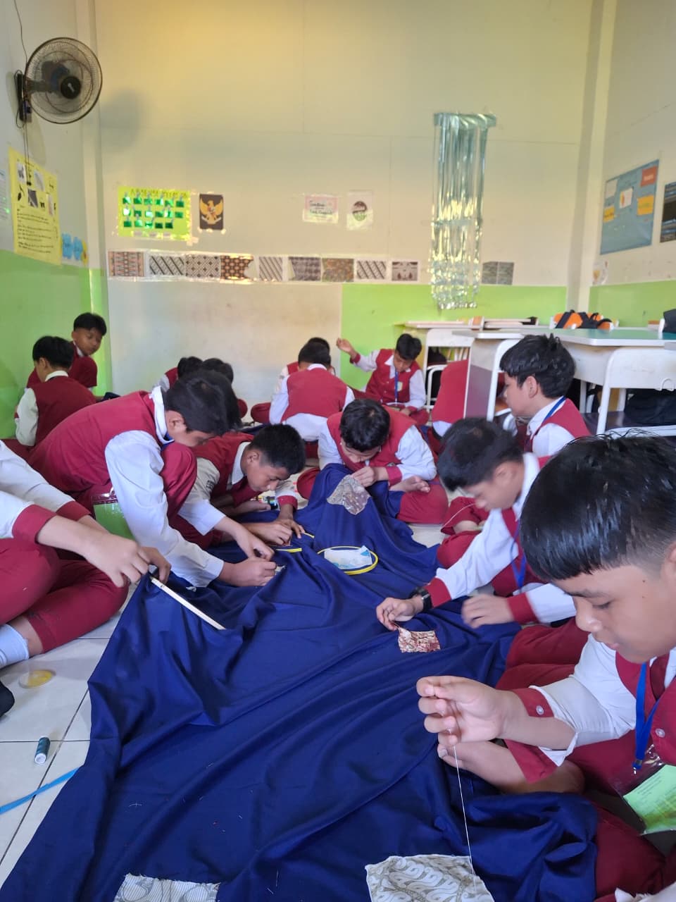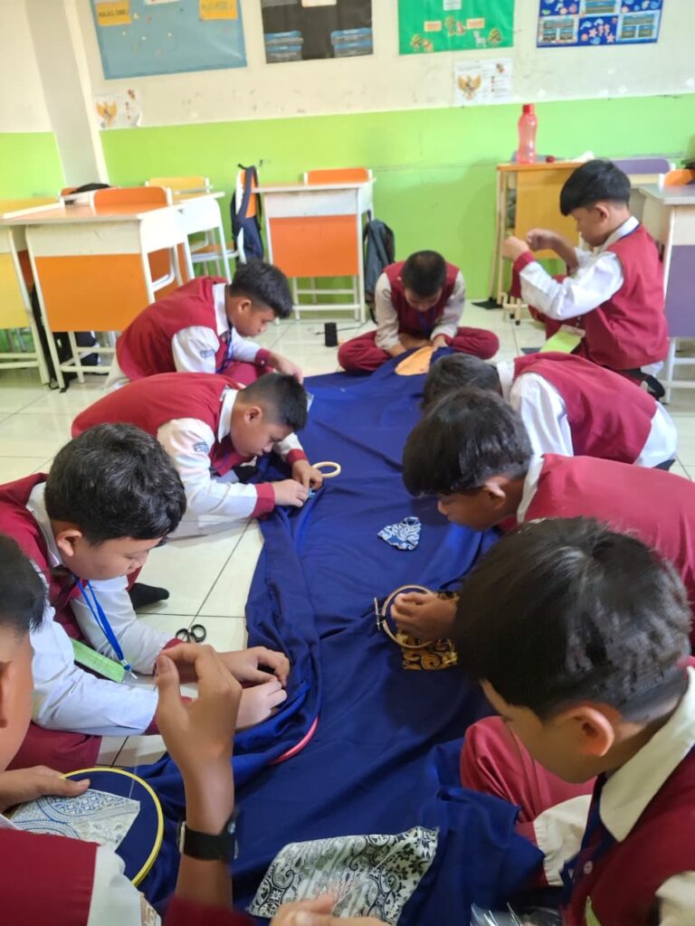 Rangkaian ujian praktik kelas 6 tahun pelajaran 2025/2026 sudah dimulai sejak Senin (13/4) kemarin. Salah satu mata pelajarannya adalah Seni Budaya (SB). Ujian praktik SB kali ini adalah menjahit kain perca batik ke dalam kain panjang yang kemudian akan dimanfaatkan menjadi taplak meja sekolah.